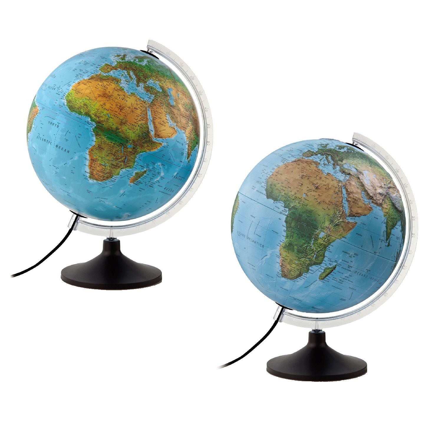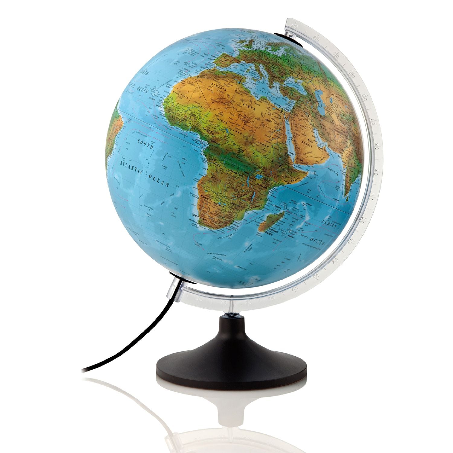 Atmosphere Doppelbild-Leuchtglobus Solid mit 30 cm Durchmesser, mit oder ohne 3D-OberflächeDieser Leuchtglobus verfügt über die beliebte Doppelbild-Funktion. Wird der Globus beleuchtet, zeigt er ein politisches Kartenbild. Unbeleuchtet kann eine moderne mit Satellitenbilder und daten erstellte physische Kartografie entdeckt werden. Die Beschriftung ist in gut leserlicher, deutscher Sprache verfasst.