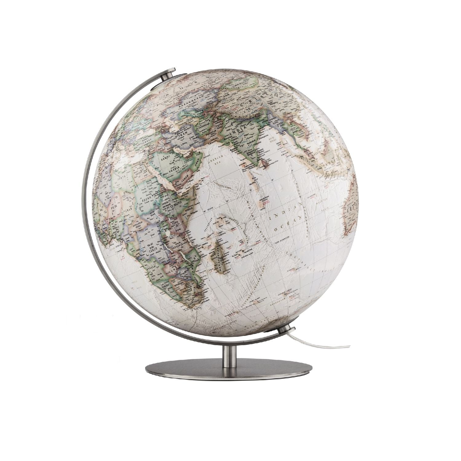 National Geographic Leuchtglobus Fusion 3703 Classic oder Executive, handkaschiert mit Edelstahlgestell und 37 cm DurchmesserDieser beleuchtete Tischglobus von National Geographic verbindet auf gekonnte Art und Weise Tradition und Moderne. Die Kugel hat einem Durchmesser von 37 cm und ist tradtionell handkaschiert mit der durch die National Geographic Maps Division erstellten Kartographie "Classic" oder "Executive". Das Kartenbild ist im Wesentlichen politisch, physische Informationen sind durch Schattierungen angedeutet. Über 2.000 geografische Namen sind auf diesem handkaschierten Leuchtglobus verzeichnet.