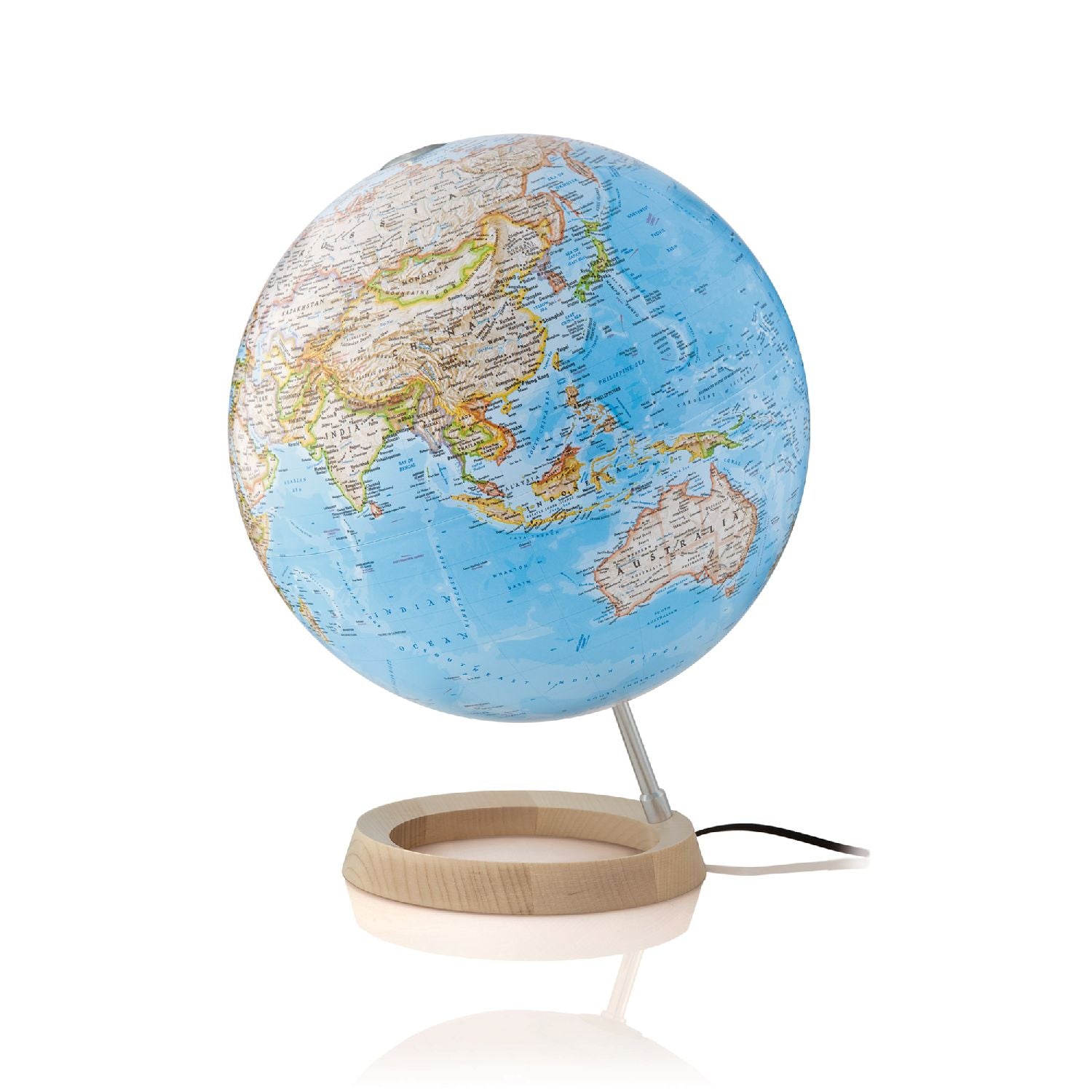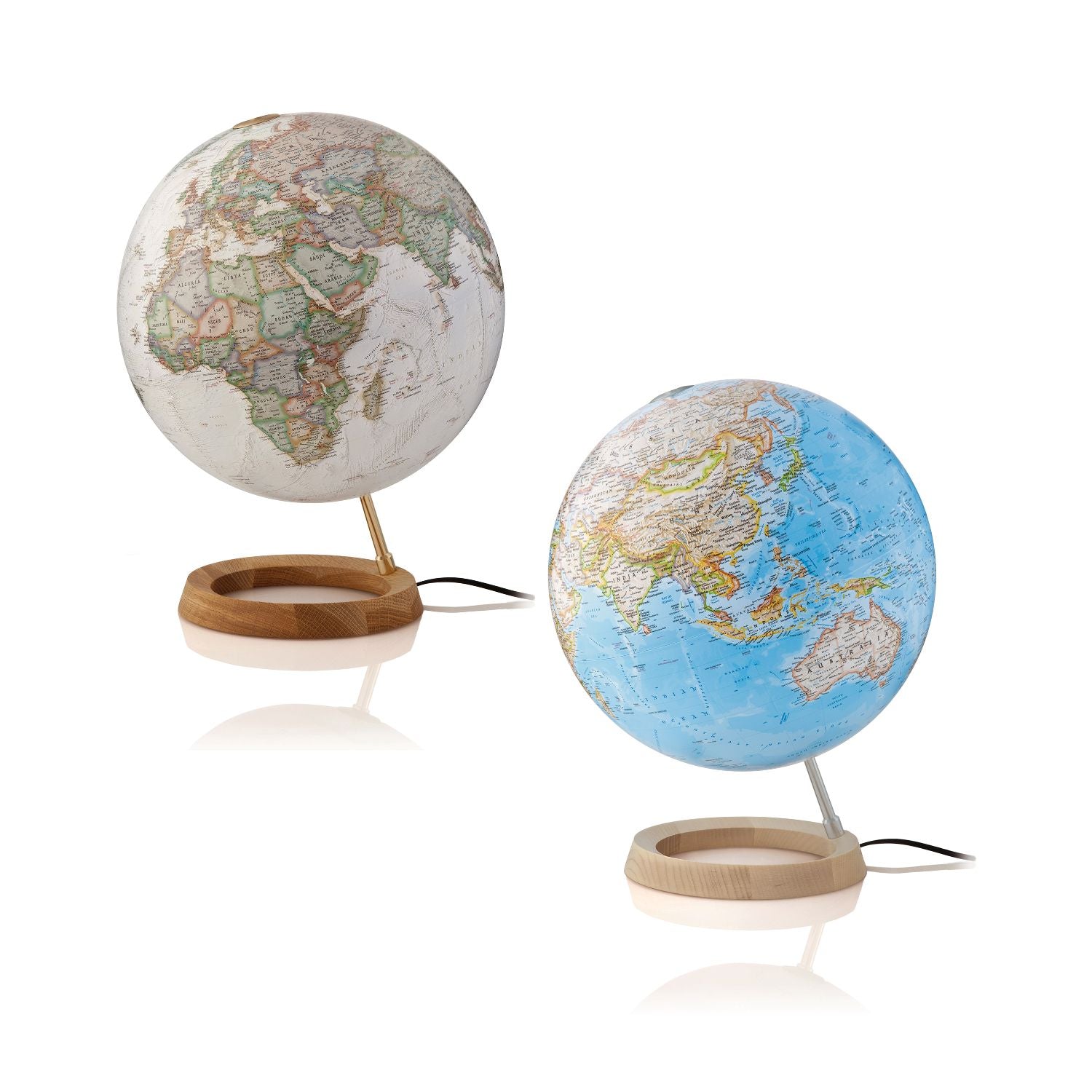 Dank des innovativen Designs des Gestells aus hochwertigem Aluminium scheint die Kugel über dem ringförmigen Fuß zu schweben. Die Neigung der Achse entspricht dabei der tätsächlichen Neigung der Erdachse. Der Globus hat eine Gesamthöhe von 40 cm.