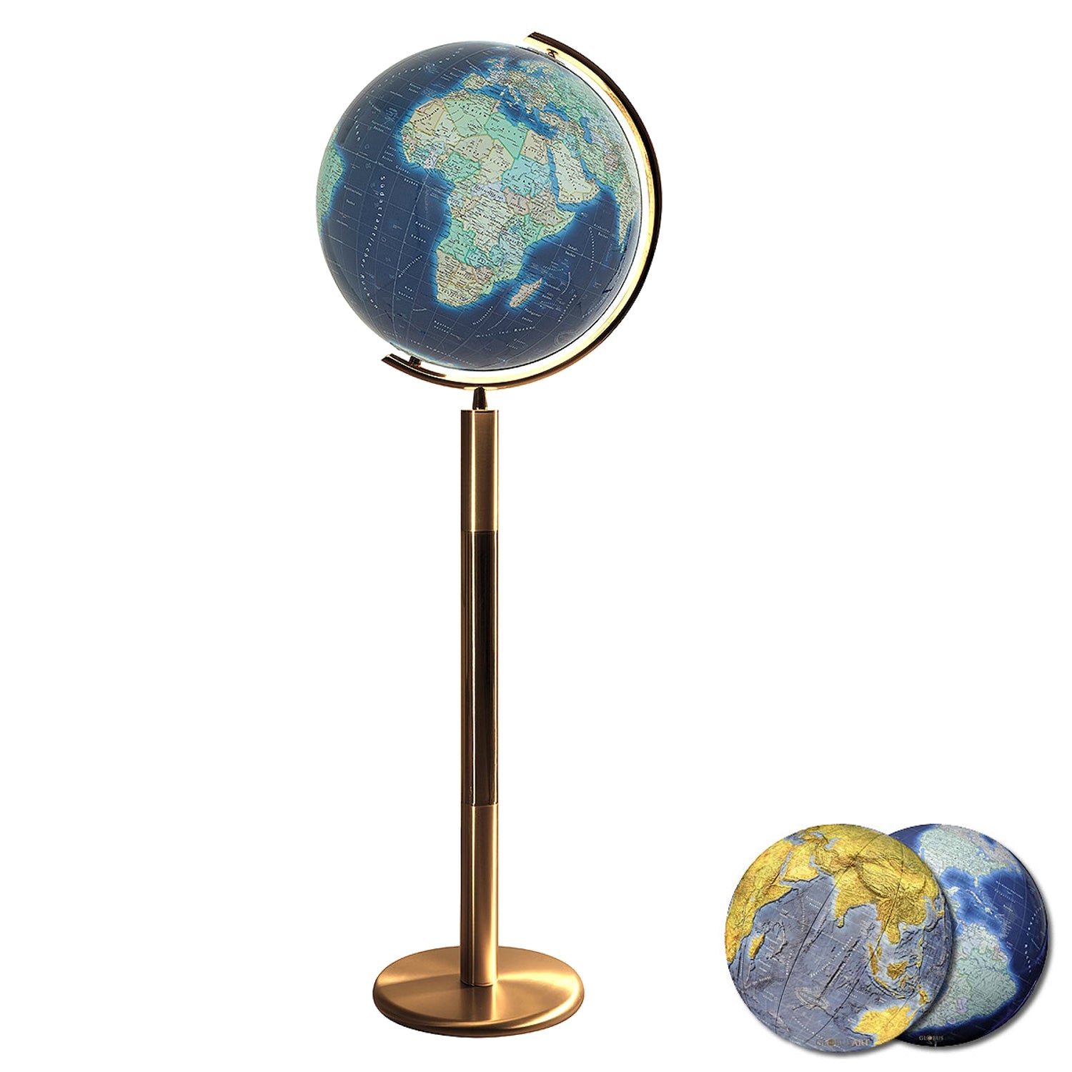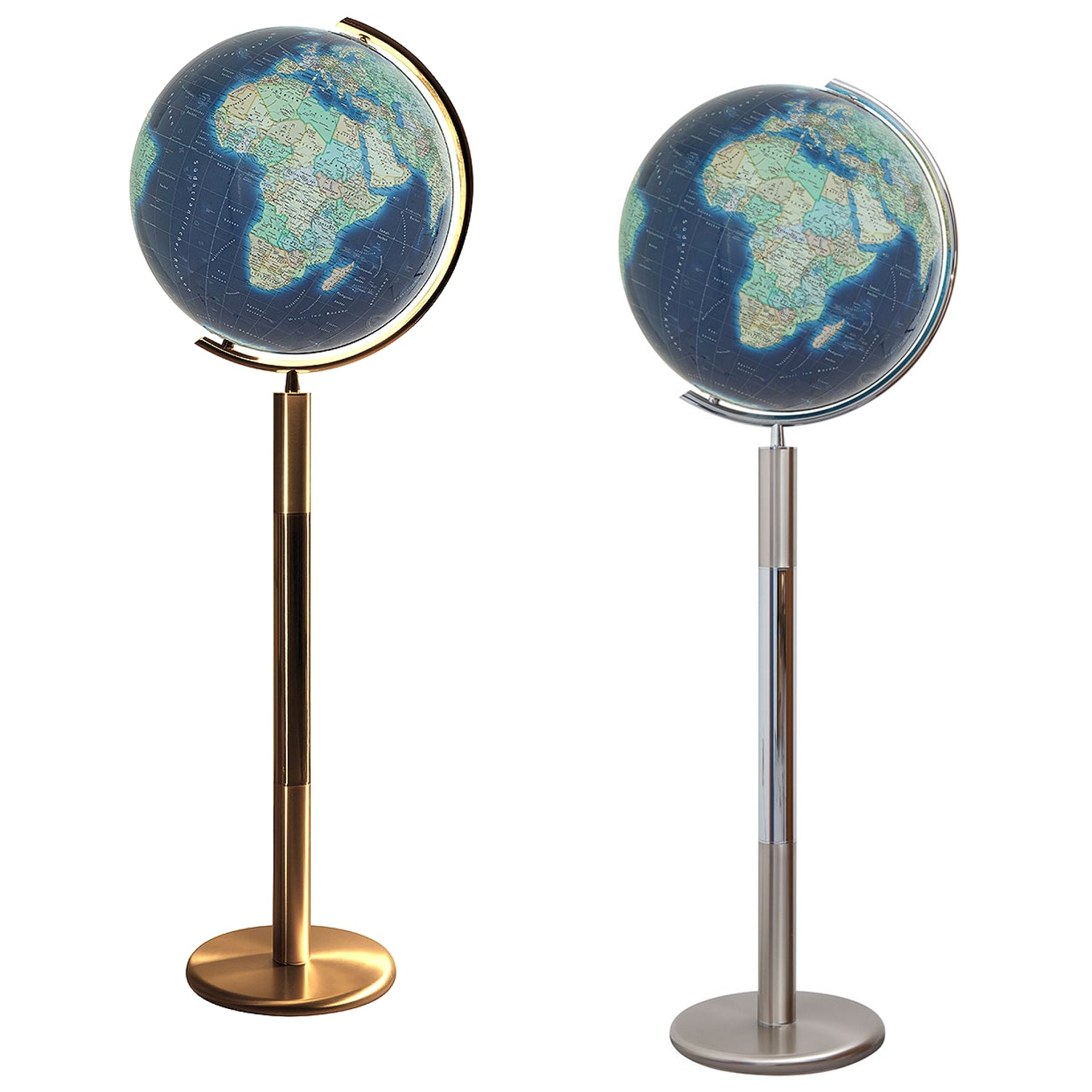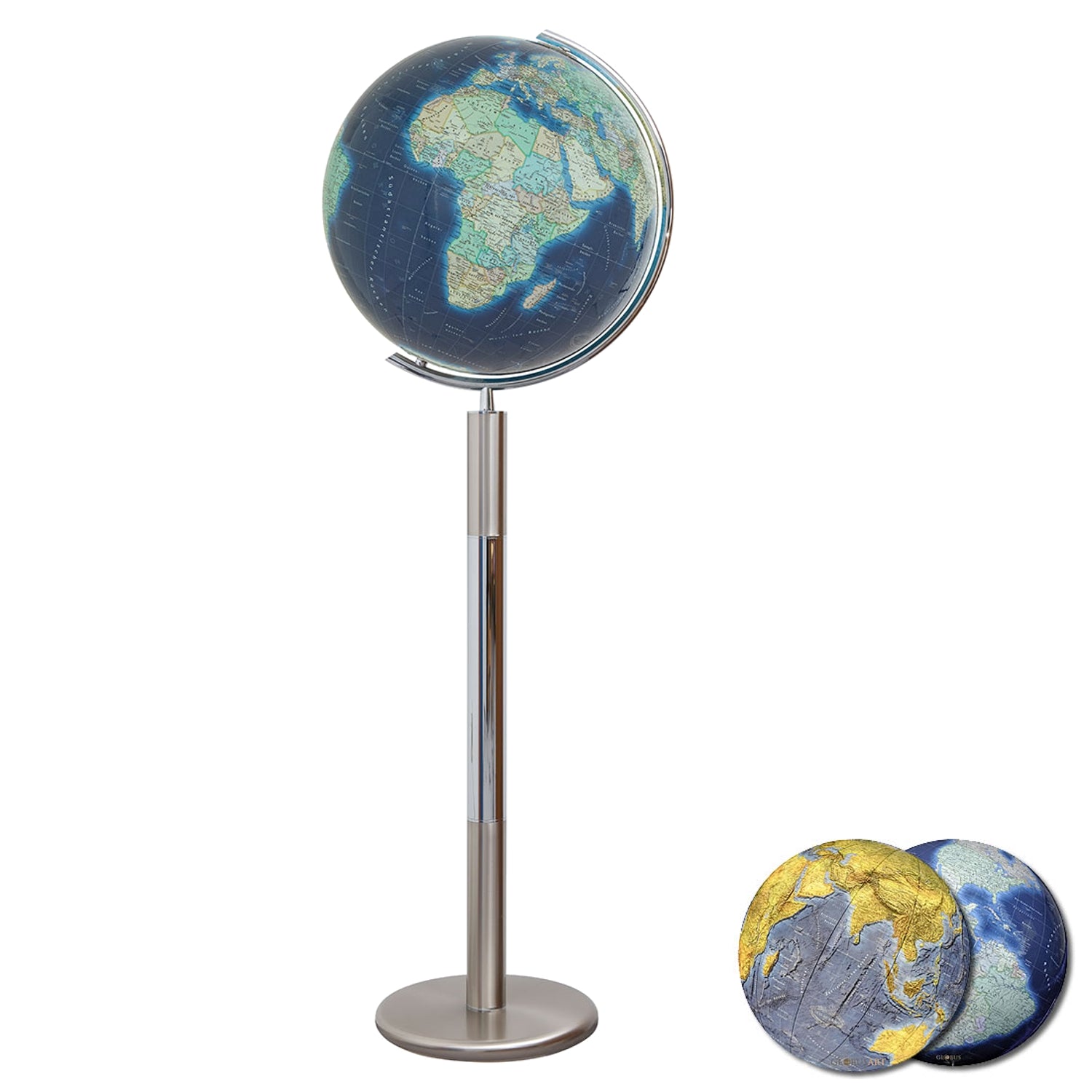 Columbus Duo Azzurro Standglobus, D 40 cm, Höhe 120cm, beleuchtet, Kristallglas, mundgeblasen, handkaschiert, verschiedene Varianten - Messing- oder EdelstahlausführungDie Duo Azzurro Standgloben sind ein elegantes Produkt aus dem Haus Columbus. Diese können sowohl beleuchtet als auch unbeleuchtet genutzt werden. Unbeleuchtet kann das tiefe Blau der Ozeane bestaunt werden. In beleuchtetem Zustand überrascht das Kartenbild mit einer erstaunlich detailreichen Bodenstruktur, welches unterschiedliche Tiefen, Vulkane und die Meeresbecken darstellt. Darüber hinaus zeigt der Globus in unbeleuchtetem Zustand ein politisches Kartenbild, wird er hingegen beleuchtet verwendet, zeigt er ein physisches Kartenbild.