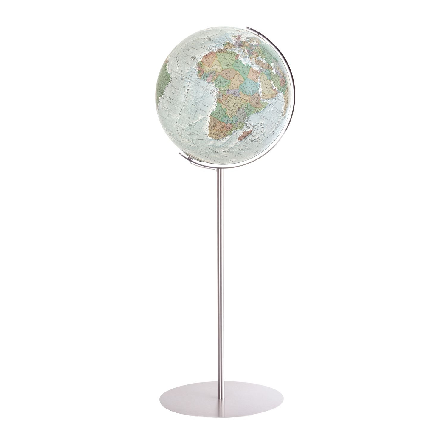 Der Leuchtglobus Duo Alba strahlt eine zurückhaltende Kühle, zugleich aber auch eine elegante Souveränität und einen präzisen Charme aus. Unbeleuchtet zeigt er ein detaillreiches politisches Bild der Erde sowie deren Meeresstruktur. Durch die Innenbeleuchtung am Abend wechselt der Globus nicht nur sein Kartenbild, sondern auch seinen Charakter. Die Meere erstrahlen im klassischen Blau, die Kontinente zeigen stolz ihre Erhöhungen durch ein plastisch wirkendes Relief in warmen Farbtönen und geben dem Raum ein angenehmes Ambiente.