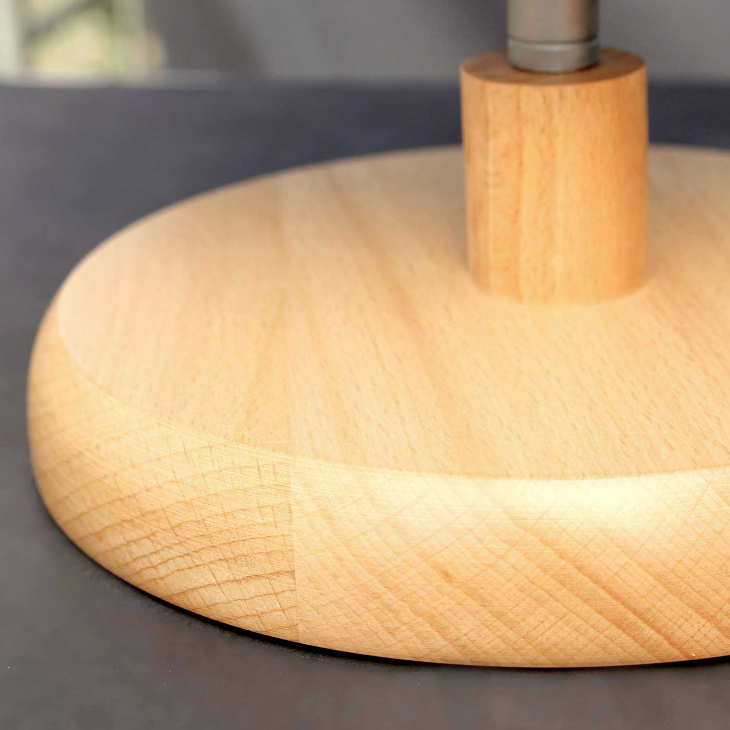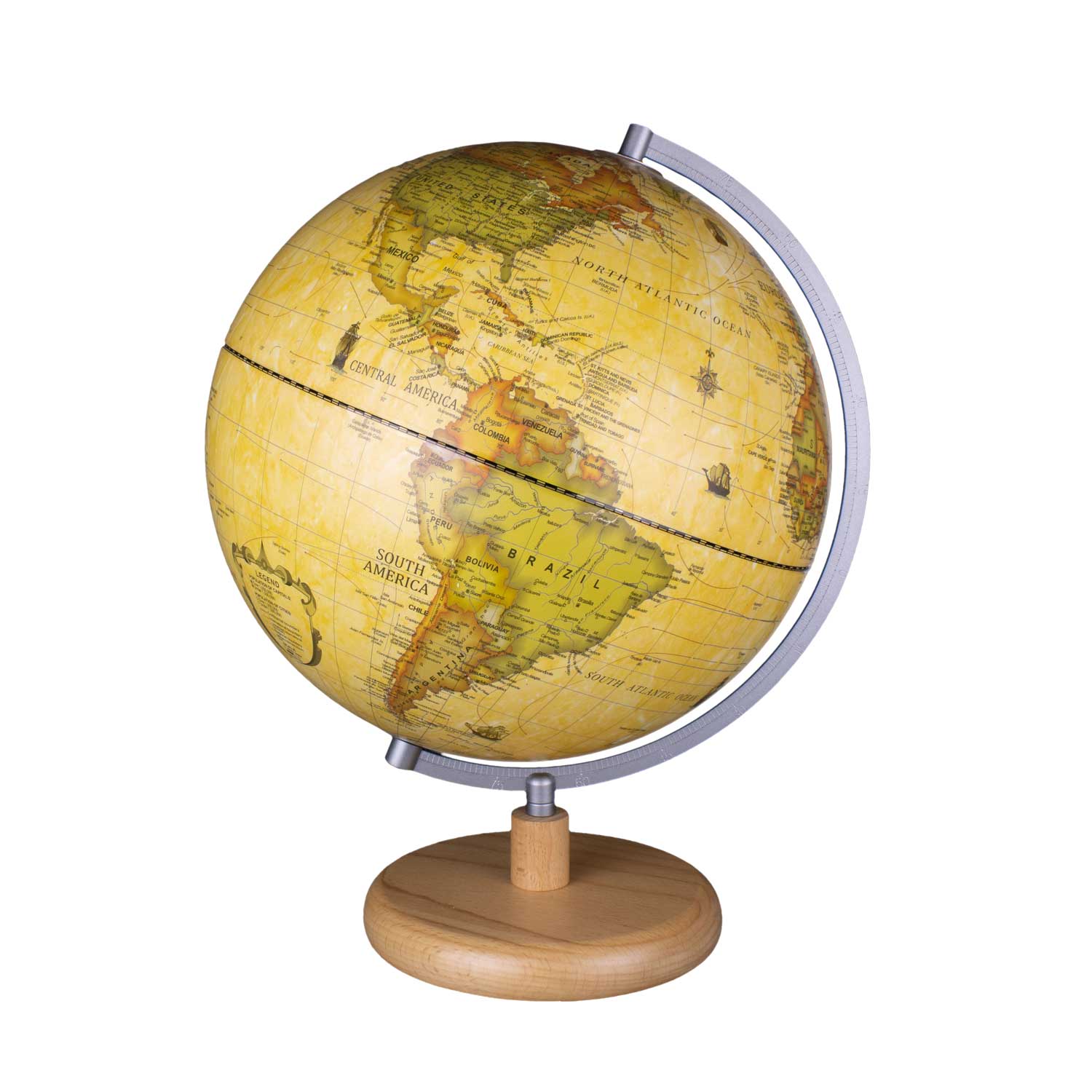 Silberfarbener Meridian und Standfuß aus hellbraunem Buchenholz wirken sowohl schlicht, wie auch dekorativ.