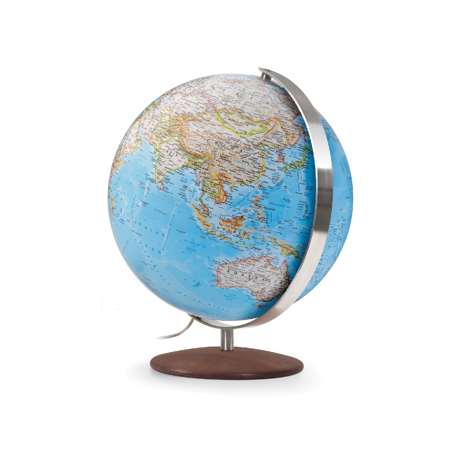 Dieser beleuchtete Tischglobus von National Geographic verbindet auf gekonnte Art und Weise Tradition und Moderne. Die Kugel mit der durch die National Geographic Maps Division erstellten Kartographie "Classic" oder "Executive" hat einem Durchmesser von 30 cm. Das Kartenbild ist im Wesentlichen politisch, physische Informationen sind durch Schattierungen angedeutet. Über 2.000 geografische Namen sind auf diesem Leuchtglobus verzeichnet.